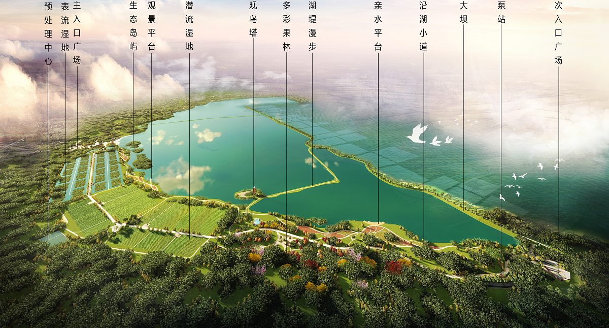 3、水生態(tài)工程:潛流濕地工程6h平方米;表流濕地人工濕地7.9 h平方米;綠化種植25.28h平方米,配套服務(wù)建筑共計1132.46平方米;修建環(huán)湖路10.932千米,次支園路6.580千米;場地鋪裝共計23127平方米;生態(tài)浮島、太陽能等原位處理工程;
