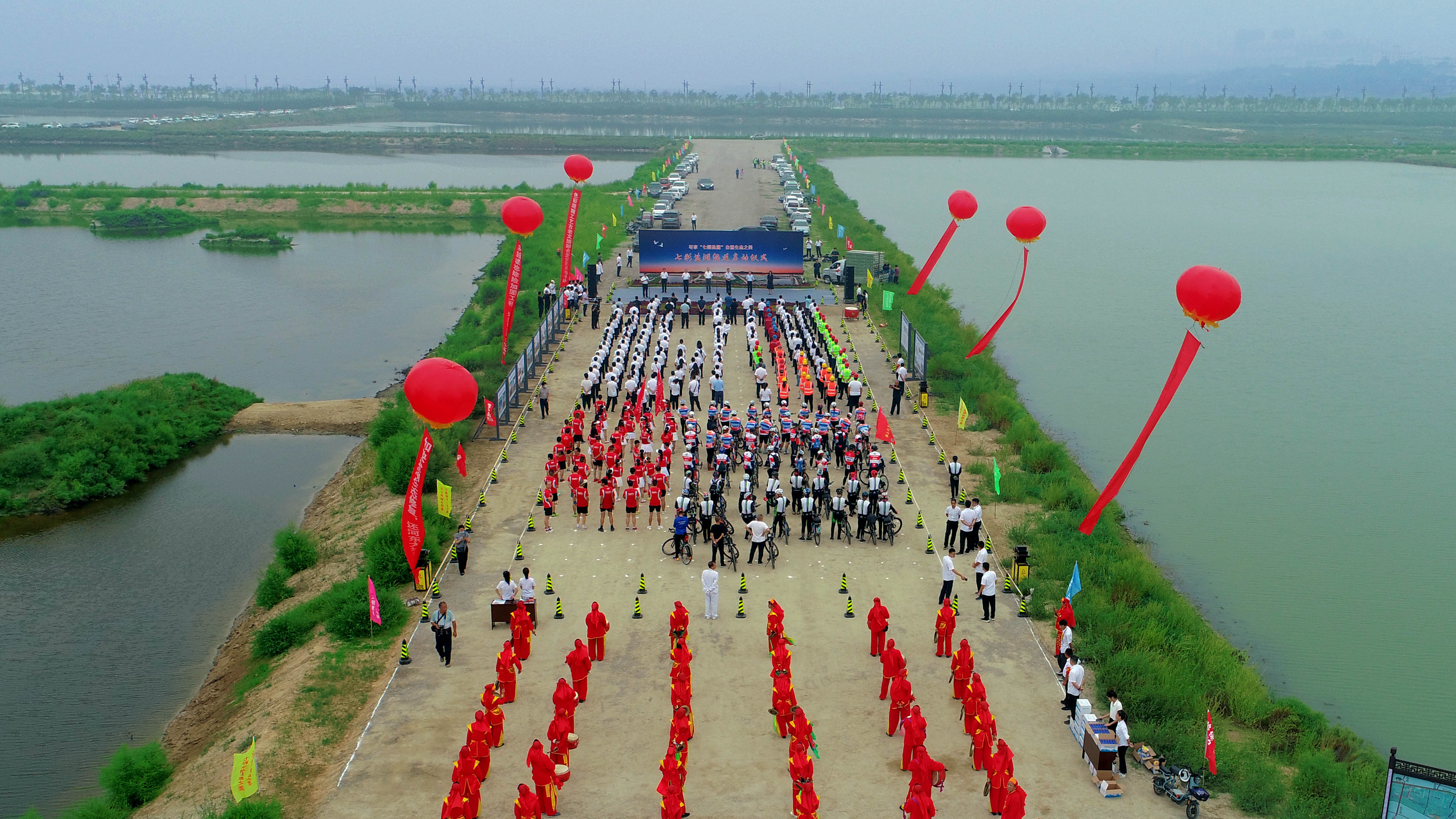 啟動儀式由鹽湖生態(tài)保護與開發(fā)中心主任孫冬青主持,市人大、市政協(xié)、市紀委監(jiān)委、市委宣傳部、市委組織部、鹽湖區(qū)委、區(qū)政府等23家市、區(qū)相關(guān)單位和各參建單位參加了啟動儀式。市水投公司董事長崔作銘介紹了鹽湖堤埝除險加固及生態(tài)修復(fù)(一期)項目建設(shè)概況,市委常委、副市長董旭光宣布七彩鹽湖綠道啟動。百 人齊聚,千鴿展翅競飛,共同見證了這一激動人心的歷史時刻。同時在這里開展了百人酷跑和騎行團隊綠色環(huán)湖行。