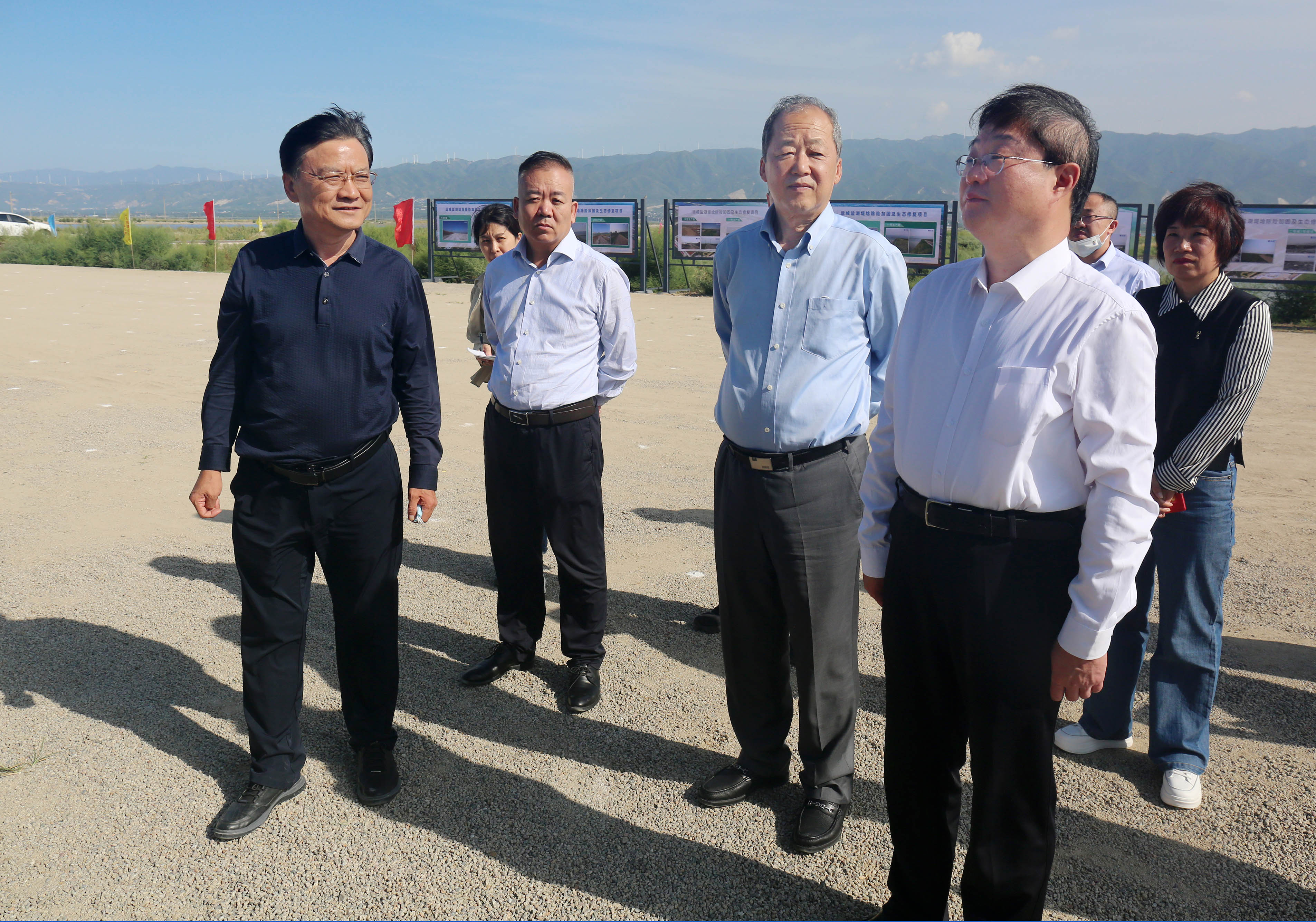9月22日,省水利廳黨組書記、廳長常建忠一行調(diào)研鹽湖生態(tài)修復(fù)治理情況,市委常委、副市長董旭光,水務(wù)局黨組書記、局長孫耀民,公司董事長崔作銘、副總經(jīng)理?xiàng)钏仄脚阃?。董事長崔作銘對(duì)常建忠廳長一行詳細(xì)匯報(bào)了鹽湖堤埝除險(xiǎn)加固及生態(tài)修復(fù)項(xiàng)目建設(shè)情況。