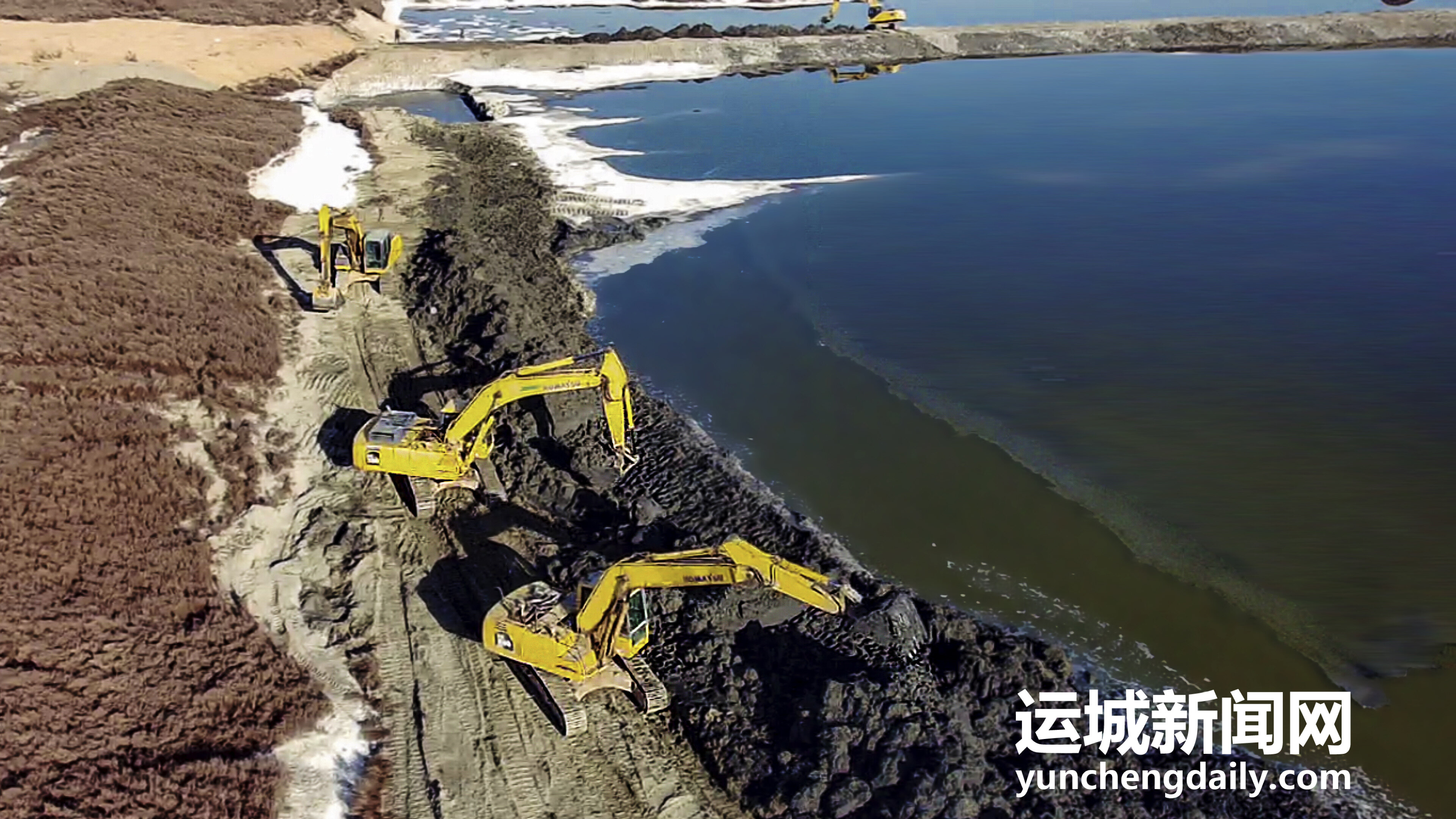 2022年12月18日,鹽湖景區(qū)內(nèi),工人師傅正在對堤埝進行除險加固。