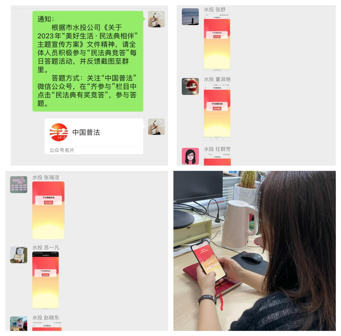 為加大《民法典》宣傳,努力讓每一名干部職工走進(jìn)民法典、了解民法典、運(yùn)用民法典,切實(shí)增強(qiáng)廣大干部職工的法治意識(shí)和法治信仰,5月29日運(yùn)城市水利工程建設(shè)局有限公司組織干部職工開(kāi)展2023年“美好生活•民法典相伴”主題活動(dòng)?;顒?dòng)現(xiàn)場(chǎng)傳達(dá)了運(yùn)城市水務(wù)投資建設(shè)開(kāi)發(fā)有限公司《關(guān)于2023年“美好生活•民法典相伴”主題宣傳方案》,并向大家介紹了民法典的重要意義。活動(dòng)中干部職工積極關(guān)注“中國(guó)普法”,注冊(cè)賬號(hào)并進(jìn)行了答題。此次活動(dòng)激發(fā)干部職工主動(dòng)學(xué)習(xí)法律知識(shí),增強(qiáng)了用法治思維和法治方式解決問(wèn)題的能力。