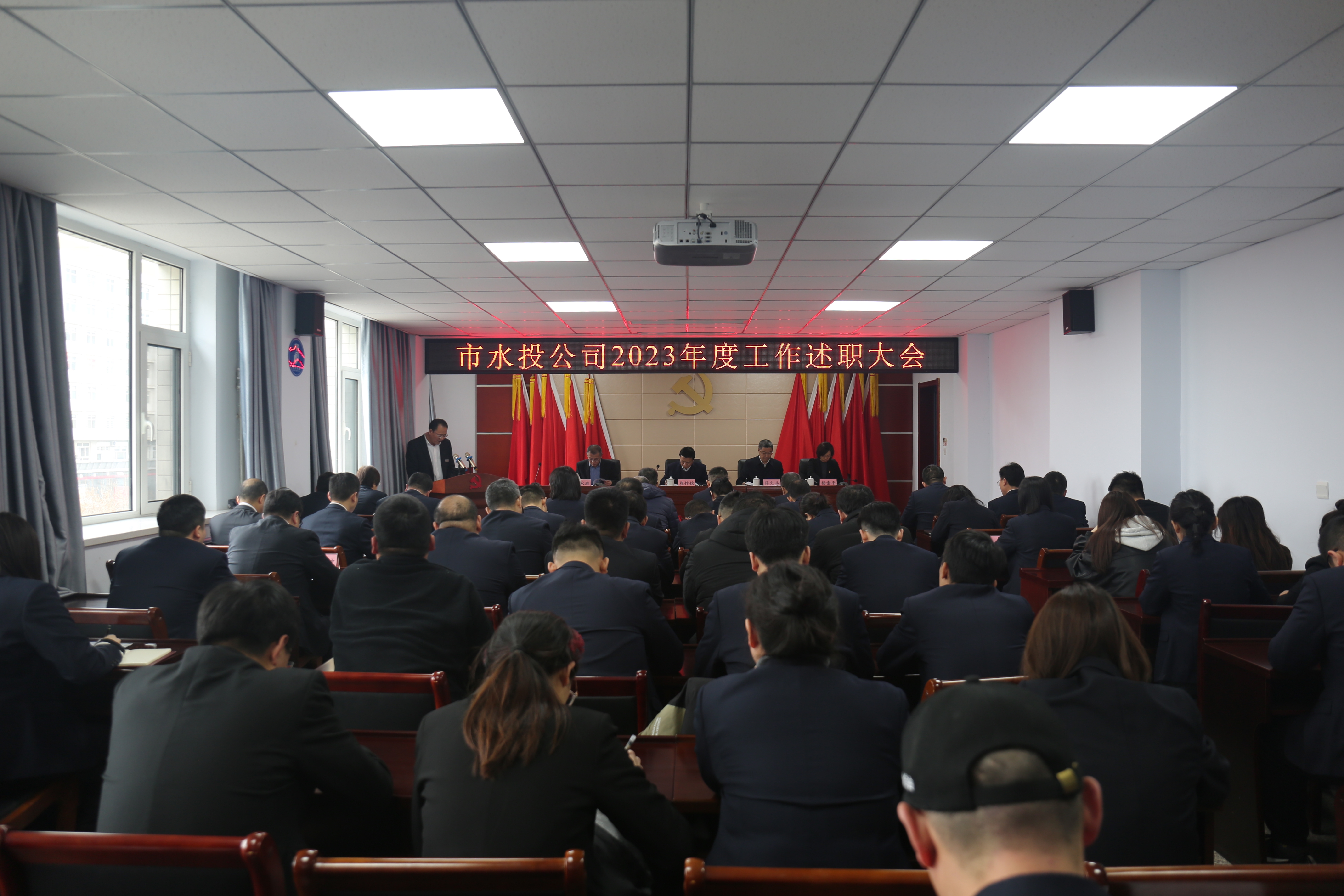 沉淀過往,迎接新光。為全面總結(jié)2023年度工作,分析研判當前工作形勢,科學合理安排2024年工作。2月23日,公司召開2023年度述職大會。公司黨委班子、子公司班子成員及機關(guān)全體干部職工共計60余人參加會議??偨?jīng)理薛文兵主持會議。